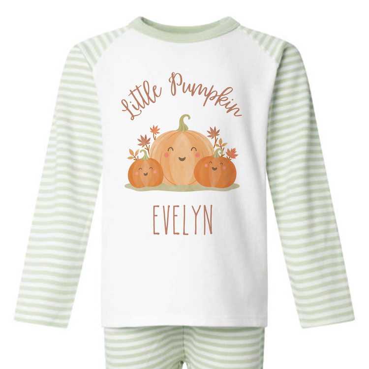 Cozy up for fall with these adorable personalized "Little Pumpkin" pyjamas! Featuring a charming design of three smiling pumpkins surrounded by autumn leaves, the top showcases the sweet phrase "Little Pumpkin" above your child's name — in this case, Evelyn. The set includes a soft, long-sleeve top with beige and white striped sleeves, paired with matching striped pants for a snug and comfy fit. Perfect for fall nights, Halloween festivities, or pumpkin patch adventures!