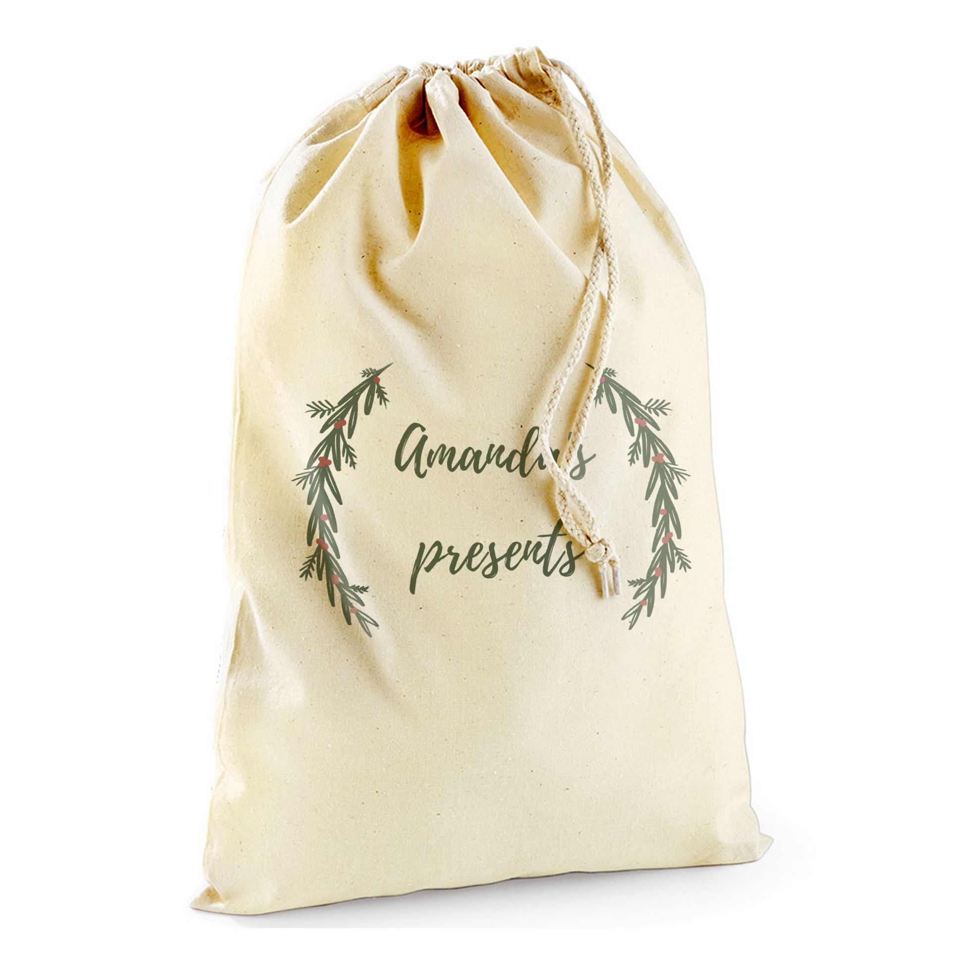 Personalised Wreath Sack with Christmas Gifts 100% Cotton