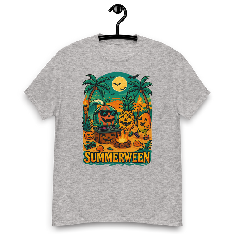Celebrate Halloween with a tropical twist! This Summerween Fruit Party T-Shirt features a hilarious mashup of spooky jack-o’-lantern faces and tropical fruits like watermelon, pineapple, and mango—all living it up at a beach bash with tiki torches, campfires, and good vibes.
